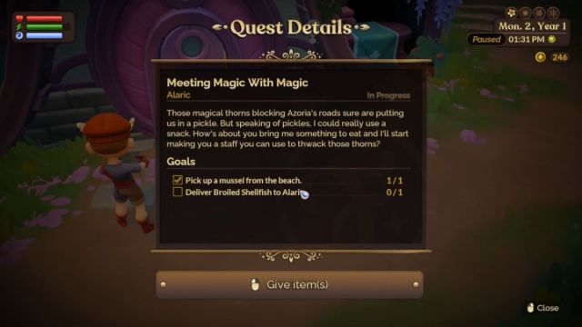 Чтобы найти Аларика, вы можете проверить карту и отследить его местонахождение. Аларика часто можно встретить возле розового дома в Восточном городе , он ждет, чтобы помочь вам в вашем тернистом путешествии. Этот причудливый волшебник предлагает изготовить волшебный посох, способный справиться с шипами, но есть одна загвоздка: сначала ему нужно удовлетворить свой аппетит. Чтобы продвинуться дальше в квесте, вам необходимо найти и приготовить мидию.