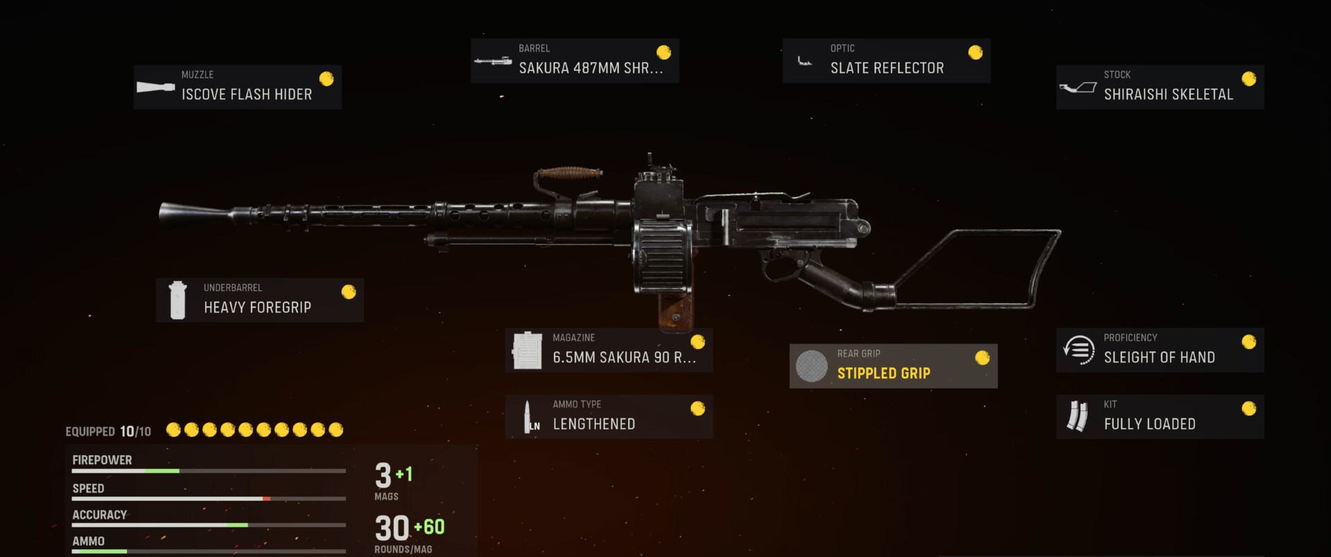 Первое, что вам нужно надеть, это дула Iscove Flash Hider Muzzle. Таким образом вы сможете лучше маскировать дульную вспышку и контролировать отдачу. Кроме того, 487-миллиметровый закрытый ствол Sakura дает вашему ручному пулемету множество преимуществ. Это сделает ваше оружие очень точным и управляемым, уменьшит раскачивание прицела и удар оружия, а ваш урон не будет уменьшаться с увеличением дальности. Это ценный вариант для обеспечения того, чтобы ваш Type 11 был сильным соперником на средних и дальних дистанциях. Кроме того, для повышения точности Heavy Foregrip улучшает стабильность прицеливания, восстановление отдачи и устойчивость при ходьбе. Усиление этого с помощью Stippled Grip улучшит восстановление отдачи, а также начальную точность и отдачу, облегчая центрирование оружия.